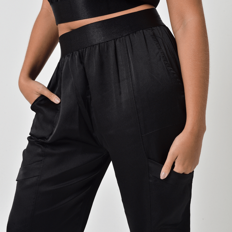 Confeccionada em 100% poliéster, o tecido de alta qualidade proporciona o máximo de conforto. A cintura com elástico garante um ajuste prático e personalizado, enquanto os bolsos-faca e os dois bolsos mais abaixo adicionam funcionalidade e um toque moderno à peça.