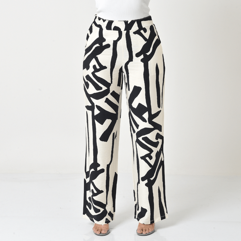 A Calça Pantalona é a peça ideal para quem busca conforto, elegância e um toque artístico no visual. Com uma modelagem ampla e fluida, ela garante um caimento leve e sofisticado, perfeito para os dias mais quentes ou para ocasiões que pedem um toque de leveza. A estampa de arte abstrata em off white e preto é moderna e única, transformando a calça em um item de destaque.