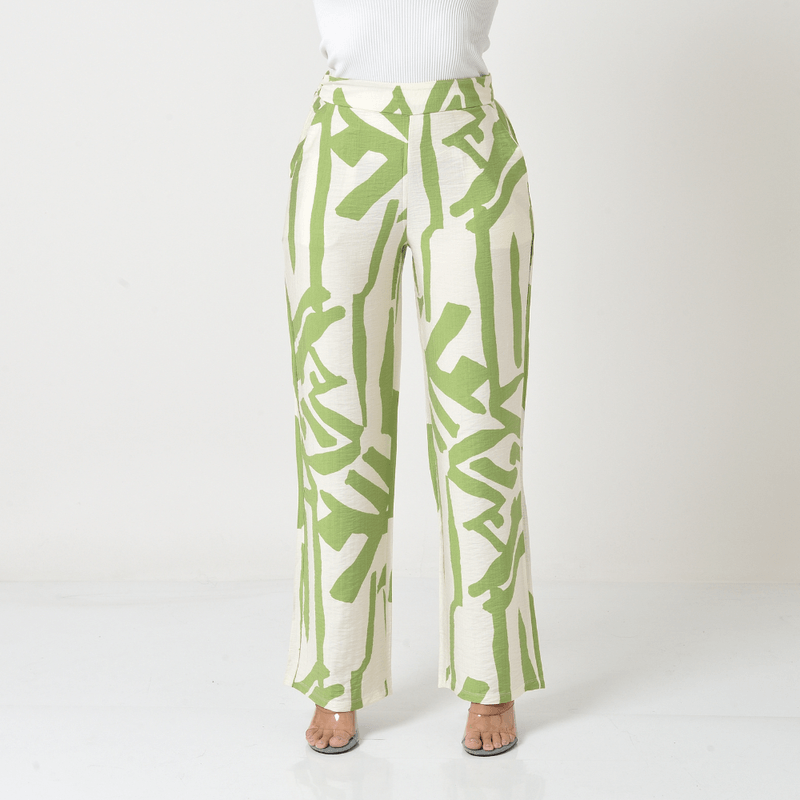 A calça pantalona é a peça ideal para quem busca conforto, elegância e um toque artístico no visual. Com uma modelagem ampla e fluida, ela garante um caimento leve e sofisticado, perfeito para os dias mais quentes ou para ocasiões que pedem um toque de leveza. A estampa de arte abstrata em off white e verde claro é moderna e única, transformando a calça em um item de destaque.