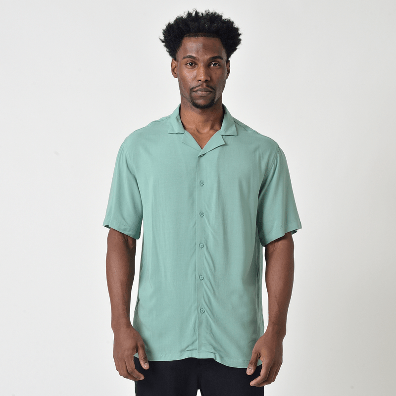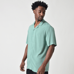 Confeccionada em 100% Viscose, a camisa oferece um caimento leve e fluido, ideal para o clima quente. A cor Verde é clássica e extremamente versátil. O design possui Mangas Curtas e uma Gola em V com Botões (Fecho em Botões), que confere um estilo casual sofisticado.