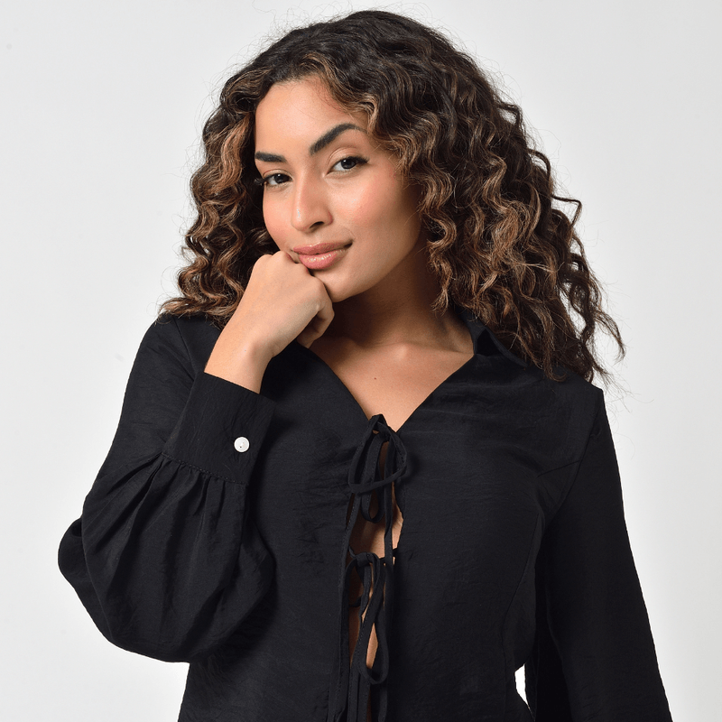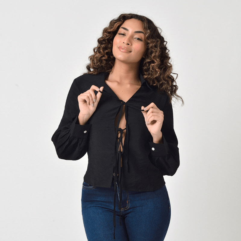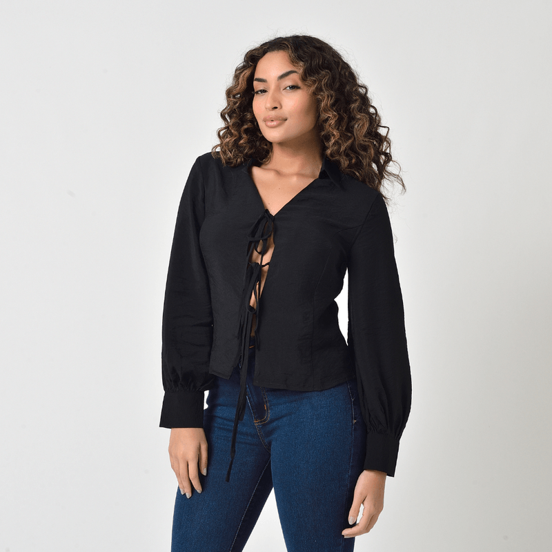 A Camisa Feminina Manga Longa na cor preta é uma peça clássica e elegante com um toque moderno, perfeita para criar looks versáteis que vão do casual ao sofisticado.