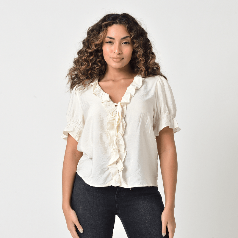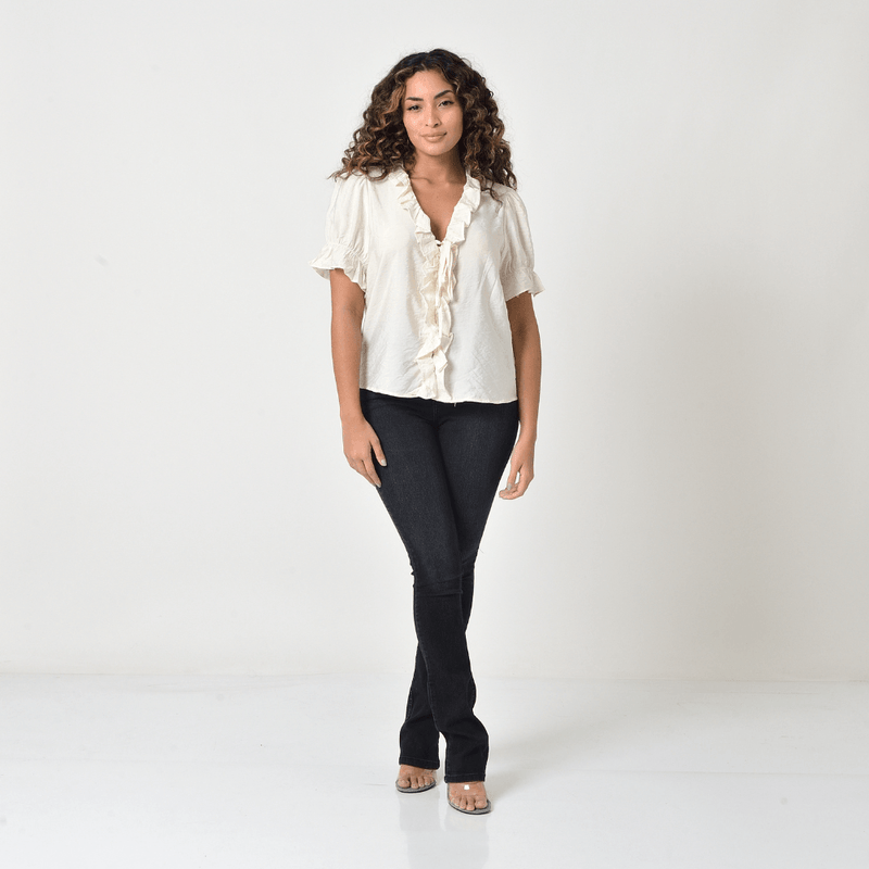 O babado e a manga bufante tornam esta camisa uma peça statement que eleva qualquer look de verão.