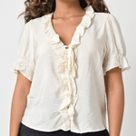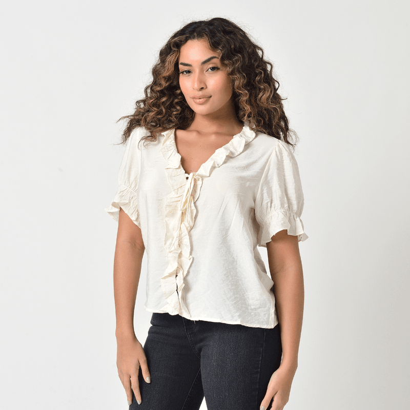 A Camisa Feminina Manga Curta na cor Off White é uma peça clássica, elegante e romântica, perfeita para criar looks sofisticados e femininos ideais para o clima quente.