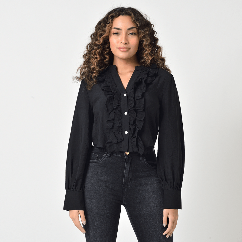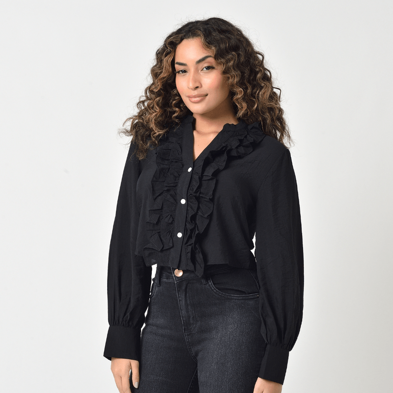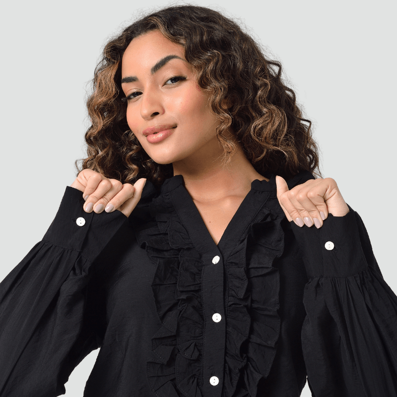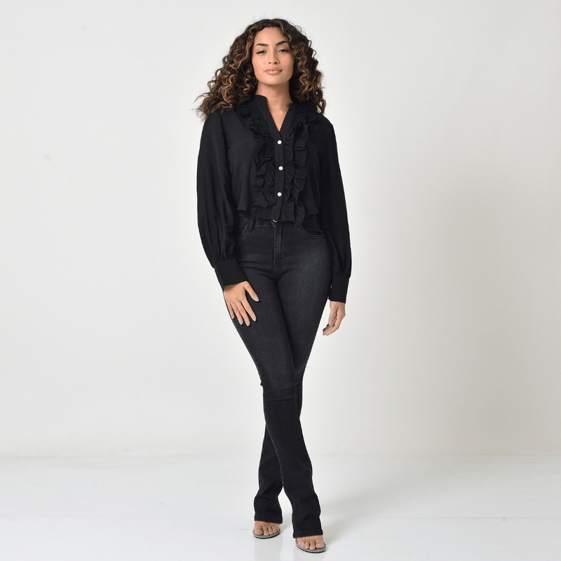 A Camisa Feminina Manga Longa na cor Preta é uma peça sofisticada e cheia de estilo, perfeita para criar looks que misturam o clássico com tendências modernas e românticas.