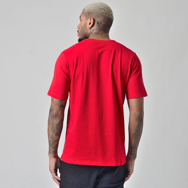 Dica: Combine a camiseta Vermelha com uma calça jeans preta ou azul escura para criar um contraste que destaca a cor. Para um look mais casual e de verão, use-a com uma bermuda de sarja em tons de cinza ou bege, finalizando com um tênis branco para um visual leve e moderno.