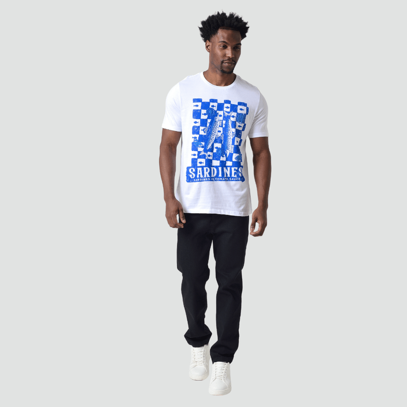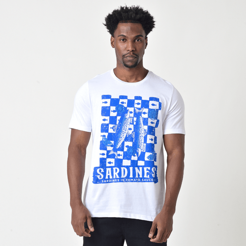 Confeccionada em 100% Algodão (Meia Malha), a camiseta oferece o toque macio e a respirabilidade ideal para o dia a dia. A cor Branca é clássica e versátil, complementada por Detalhes em Azul e a charmosa Estampa de Sardinha, que adiciona um elemento original e divertido ao look.