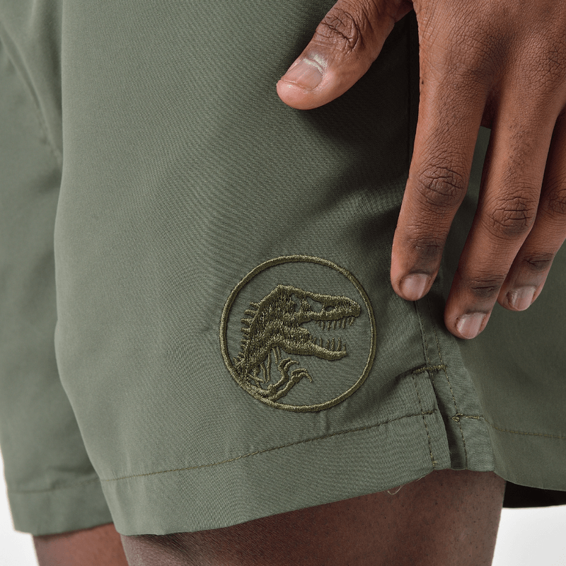 Na Água: Mergulhe para revelar a estampa temática do Jurassic, transformando o shorts azul sólido em uma peça estampada.
