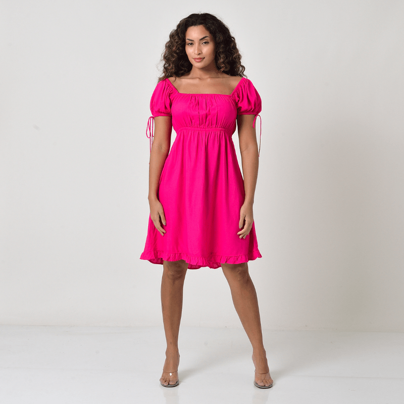 Confeccionado em 100% Viscose, o vestido garante um caimento fluido, leve e um toque agradável na pele. A cor rosa é vibrante e iluminada. O design se destaca pelo Detalhe Elástico/Franzido na cintura ou busto, que proporciona ajuste e valoriza a silhueta, e pelos Ombros Caídos, que adicionam um toque romântico e moderno à peça.
