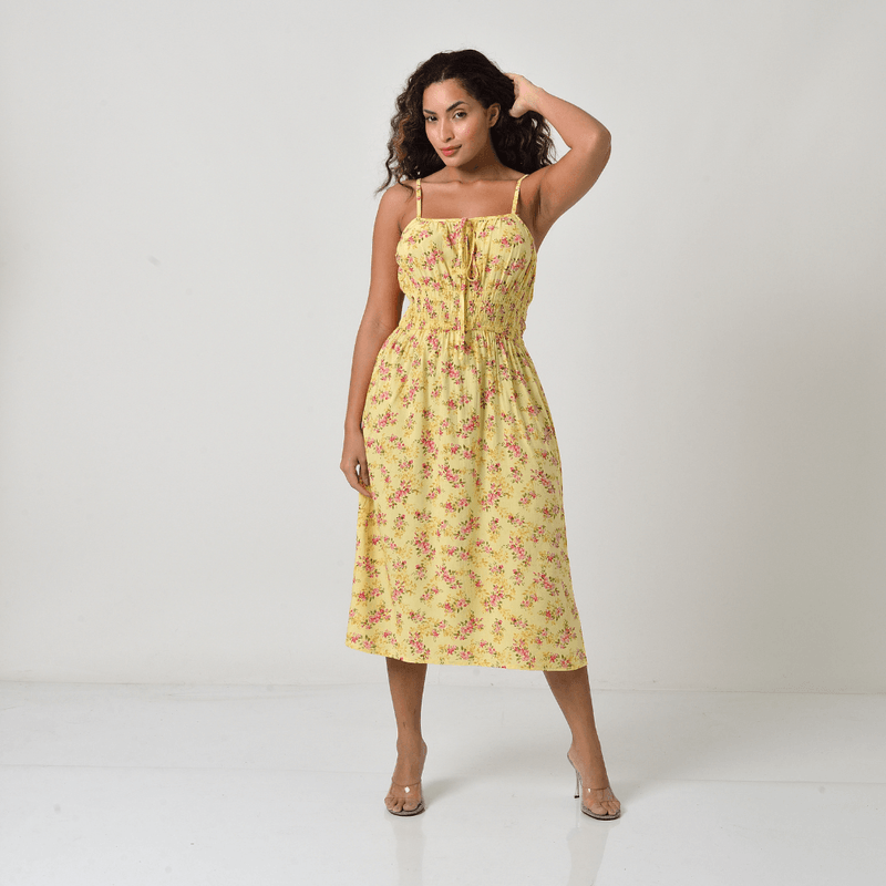Com a cor Amarela predominante, realçada por uma Estampa charmosa, o vestido é cheio de vida. Confeccionado em 100% Viscose, ele garante um caimento fluido, leve e um toque macio, ideal para o clima quente. O design é sofisticado e funcional, com um Mini Decote que pode ser ajustado por um Cordão para Amarrar, e um Elástico na Cintura que modela a silhueta e garante um ajuste confortável.